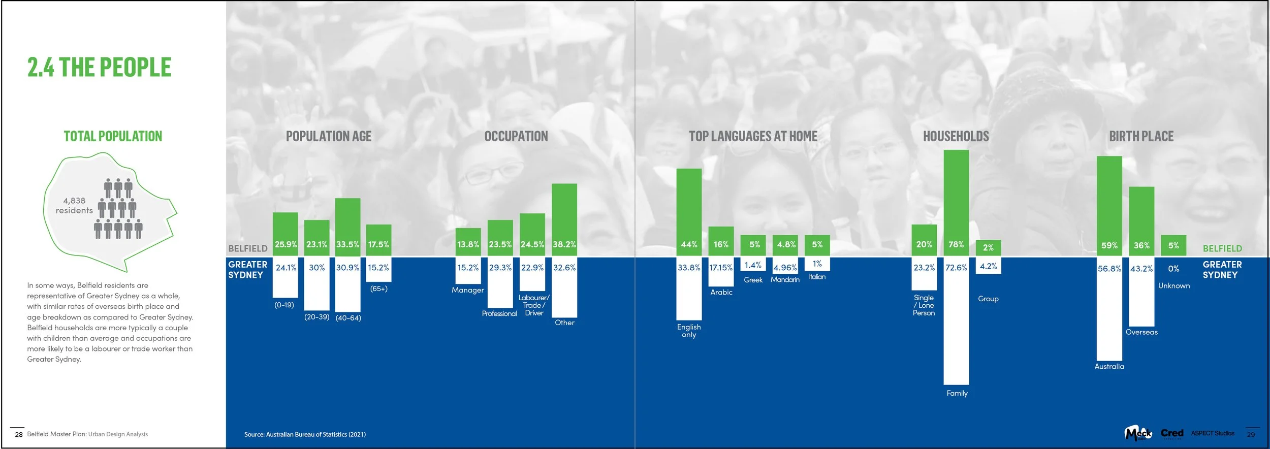 Belfield’s village character is defined by its human scale, fine-grain built form and strong local community. Burwood Road captures this most clearly, with its compact main street, inter-war shopfronts and close-knit rhythm of everyday activity. This village quality became a key organising principle for the master plan, ensuring change reinforces the existing scale, grain and social life that make Belfield feel distinctly local.