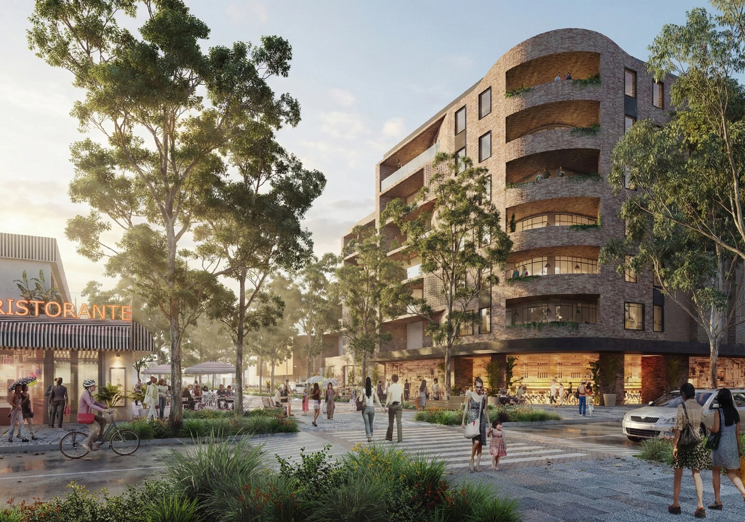 The master plan promotes incremental growth rather than wholesale change. Through detailed built form testing undertaken alongside an economics consultant, a clear “sweet spot” for uplift was identified, with heights capped at 8 storeys to support viability while retaining the village scale and character. This is complemented by streetscape and public domain upgrades across the village core, strengthening walkability and linking Belfield into Sydney’s wider Green Grid network.