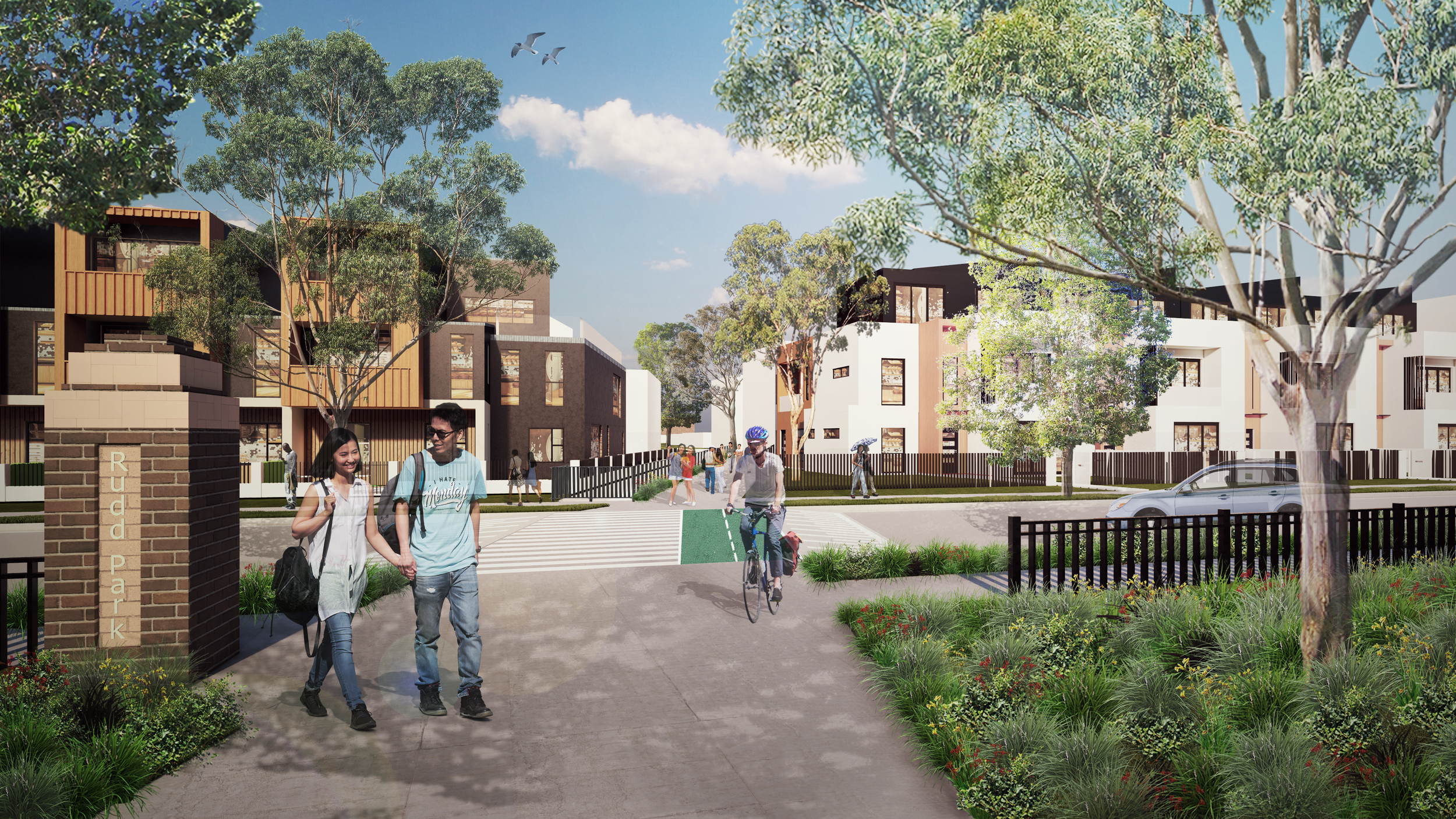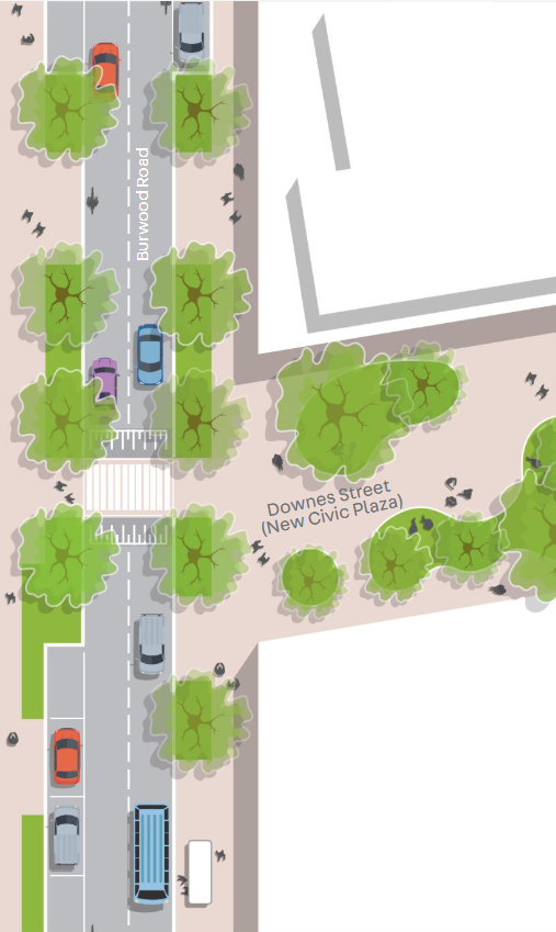Working with Aspect Studios and Arup, the master plan identified the partial closure of Downes Street at Burwood Road as a catalytic move to create a new Village Square for Belfield.