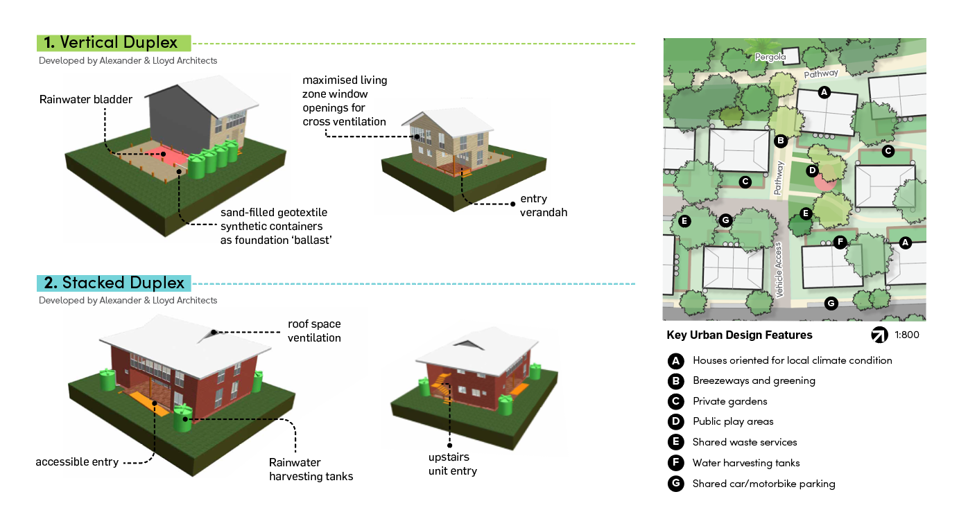 A key feature of the design is sustainable, low-cost and durable housing types created specifically for Tuvalu’s climate and to withstand cyclones. The typologies use lightweight construction, cross-ventilation, deep shade and rainwater harvesting to reduce reliance on mechanical systems while improving everyday comfort. They are shaped around outdoor living, gardens and shared spaces that support resilient family and neighbourhood life.